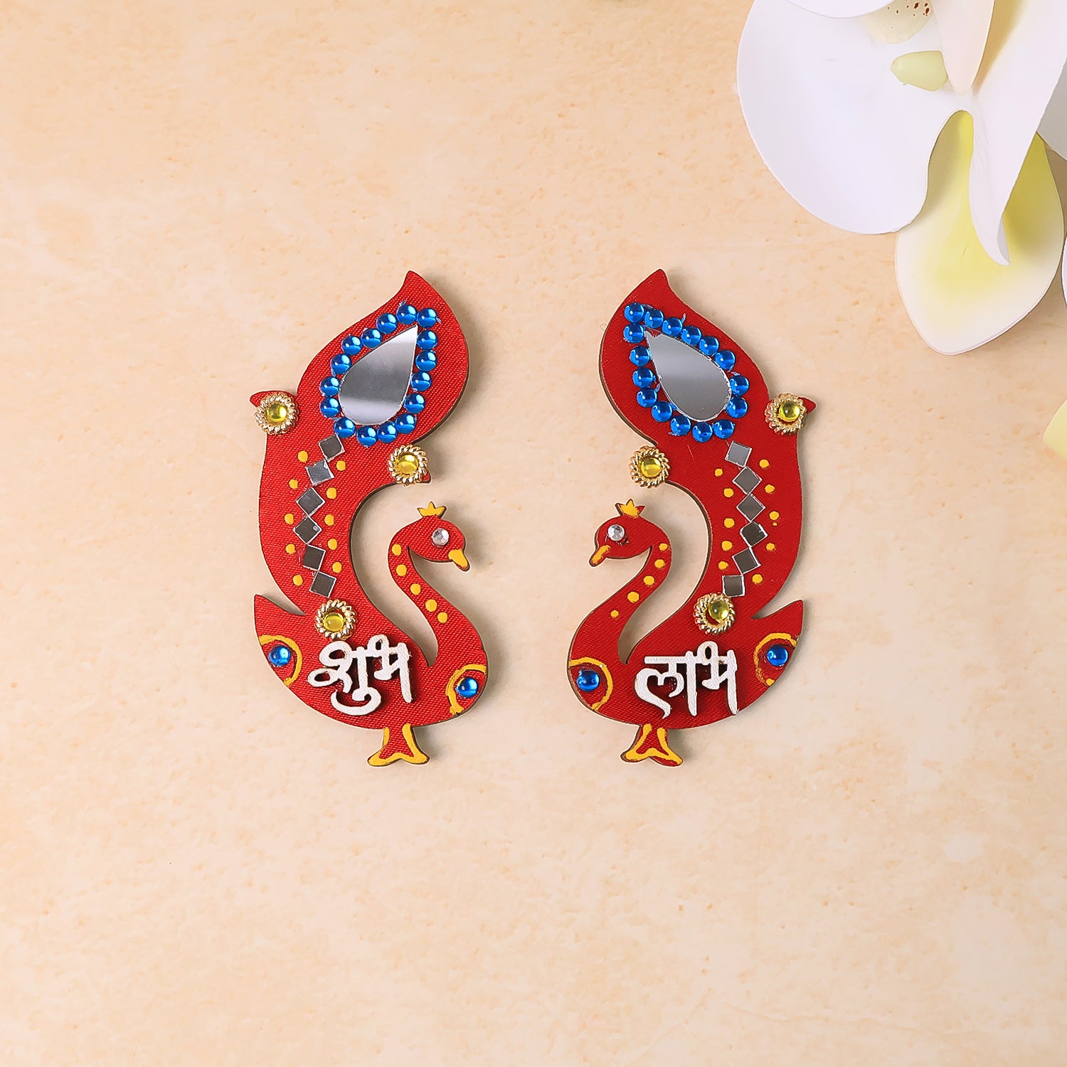 This beautifully crafted Shubh Labh Wall Hanging is designed in a graceful peacock shape, symbolizing prosperity, positivity, and auspicious beginnings. Adorned with vibrant colors, intricate stone work, and mirror embellishments, it enhances the beauty of your home entrance while welcoming guests with blessings. The set features the Hindi words "Shubh" (auspicious) and "Labh" (benefit/profit), making it perfect for traditional decor during festivals and special occasions. Made from premium quality wood with durable paintwork, this décor piece is lightweight, easy to hang, and long-lasting.