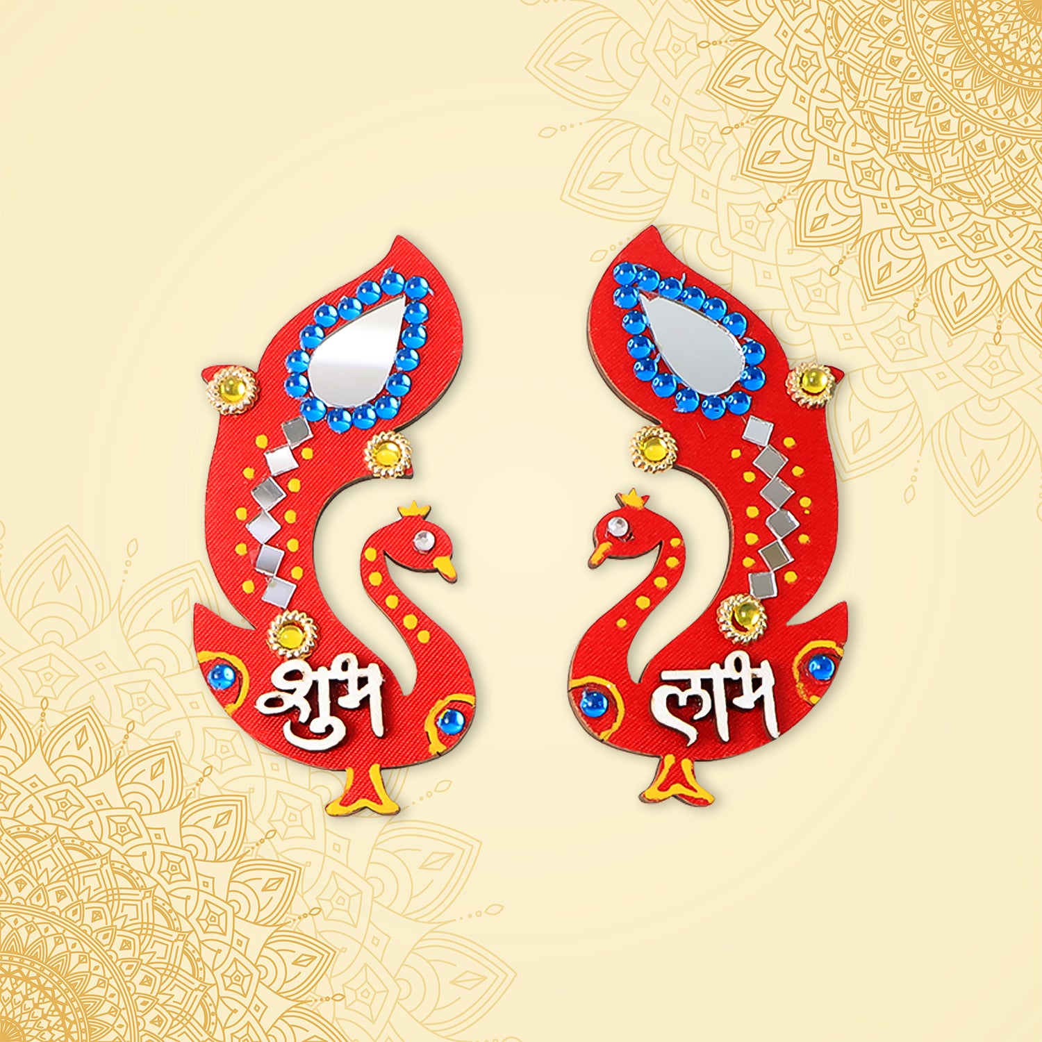 Design: Peacock-shaped with "Shubh" and "Labh" in Hindi