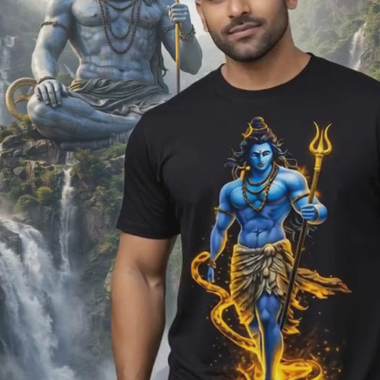 Embrace the powerful presence of the Rudra avatar with this masterfully crafted Lord Shiva graphic t-shirt. Featuring high-definition digital art, the design showcases the Mahadev in a dynamic warrior stance, complete with his iconic Trishul (trident) and the sacred serpent. The striking contrast of deep blues and radiant golden flames creates a modern spiritual aesthetic that sets this Hindu deity apparel apart from standard prints. Whether you are looking for a unique Bholenath tee or a statement piece of religious streetwear, this design captures the raw energy and divine protection of the Destroyer of Evil.