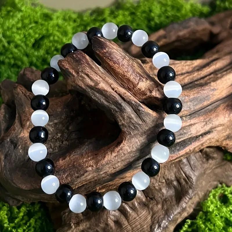 Women's Vintage Boho Stretch Energy Wristband with 6mm Cat's Eye & Obsidian Stones - Natural Healing Stone Accessory for Emotional Balance, Ideal Gift for August Birthdays, Daily & Special Occasions